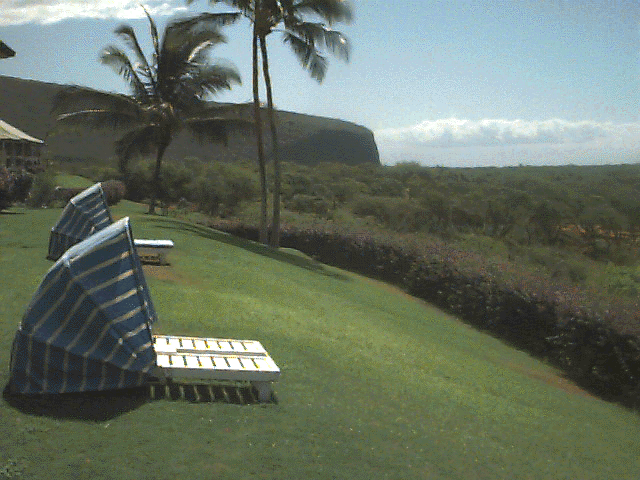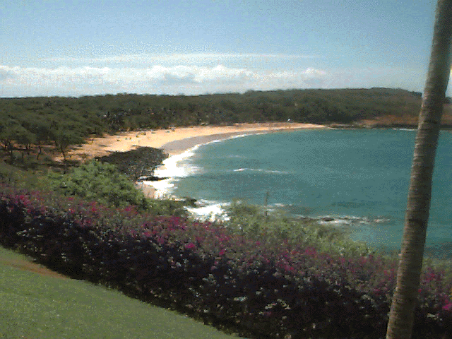 Looking out from the hotel, you can see the sandy Hulopo'e beach.